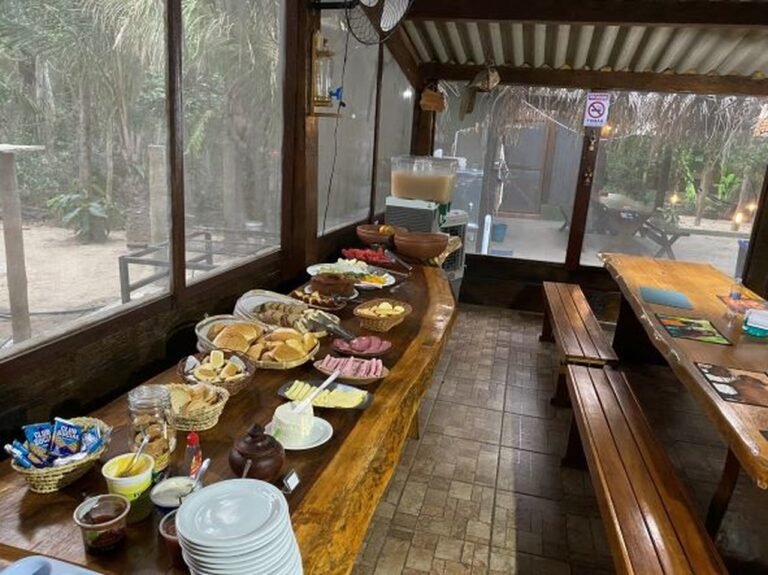 Berço Pantaneiro lodge serves the typical regional food including fish, beef and pork in the meals. Nevertheless, the buffets are rich and salads and vegetables. Overall, the restaurant is very cozy and warm with its rustic wooden tables and chair. Besides, the staff bring aptisers or a soup before the main course. All in all, the accommodarion offers water, juices and soft drinks in both occasions, during your whole stay and also during the outtings in the state park Encontro das Águas when the visitors are making their Jaguar safari.